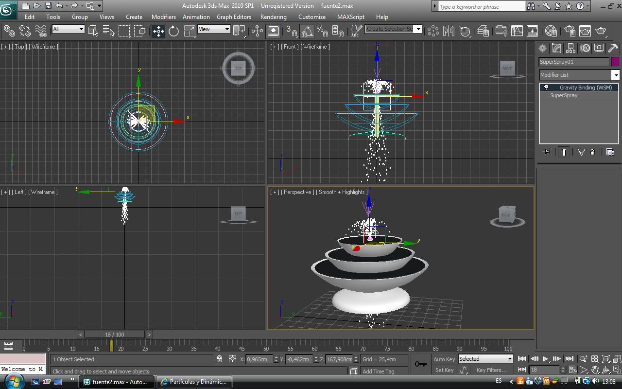 Buenos días a todos. Veréis, me estoy volviendo loca, estoy haciendo una fuente en 3ds Max, bien, para simular el agua cayendo por la fuente a modo de chorro, he creado un sistema de partículas super aerosol, y le he aplicado el efecto especial gravedad para que caiga para abajo el agua, con el chorro en si estoy bastante contenta, pero mi problema surge cuando intento que las partículas mueran el primer vaso de la fuente y no sé cómo hacerlo, he probado cambiando los parámetros, tanto del super-aerosol, como de gravedad y no encuentro la forma, lo único que me ha funcionado algo ha sido mirar en que frame colisionan las partículas en el punto que quiero, y re-escalar el tiempo de la animación, entonces ha quedado bien, pero claro, la animación dura muy poco y quisiera que durara más.