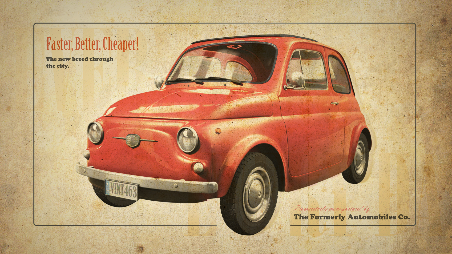 Muy buen trabajo, me gusta el montaje. Si se puede criticar, he buscado una fotografía del coche (http://img, motorpasion.com/2007/08/fiat_500_clásico.jpg) y veo que hay algunas cosas que se podrían mejorar en las texturas, como son los 4 faros, el logotipo, en el centro del capo hay una línea con un tono metálico, no sé si será de ese modelo en concreto o todos lo llevan, la verdad no tengo ni idea, y tal vez tiene demasiados reflejos para mí gusto, no quedan mal, pero para un coche tan antiguo, no lo veo yo tan reluciente, no sé, son opiniones de un ojo inexperto (no me hagas mucho caso).