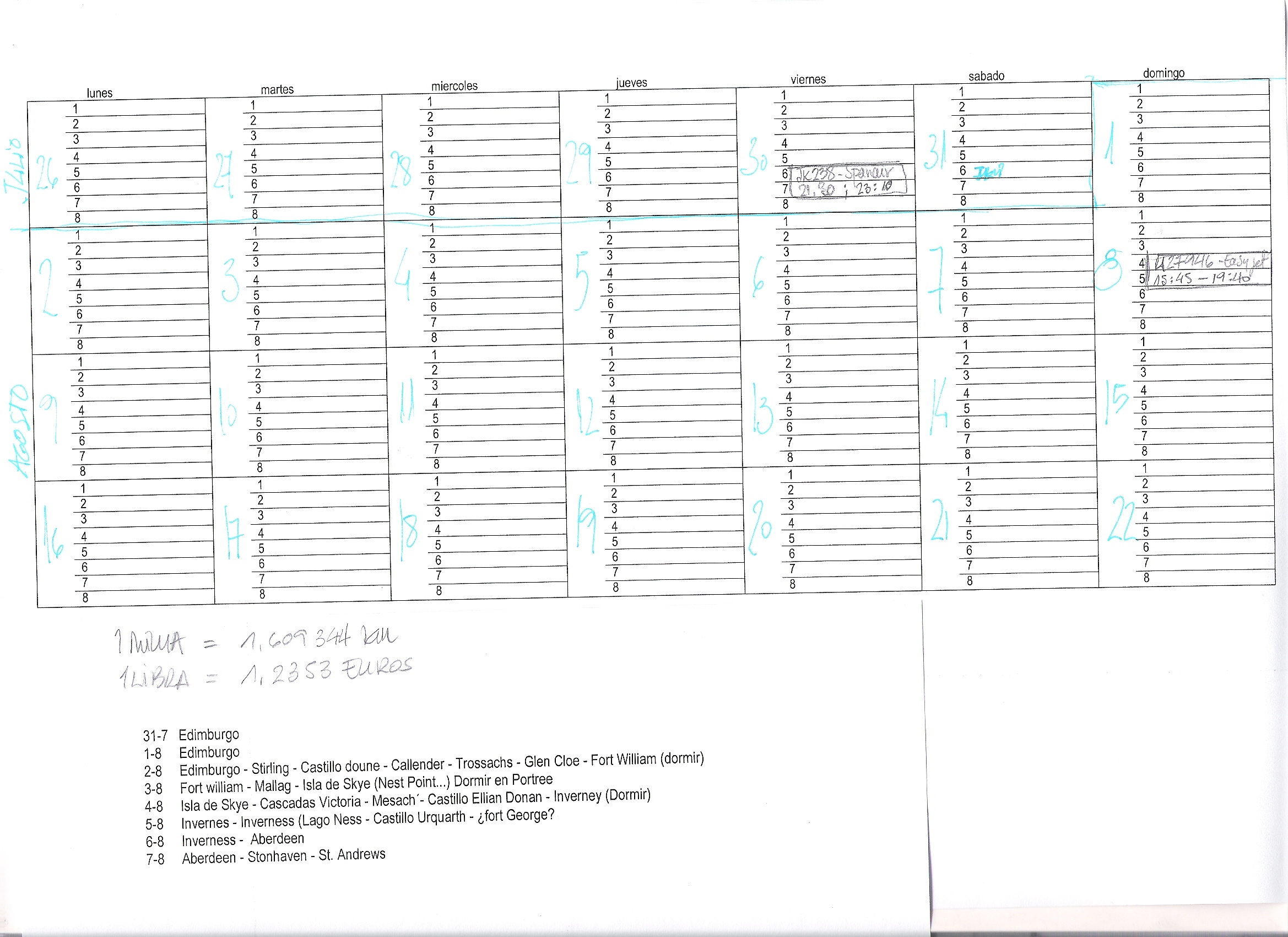 Hola a todos, resulta que del 31 al 8, voy a hacer un viaje por Escocia, empezando por Edimburgo. Me gustaría, en la medida de lo posible, los que vivan por esos lares o hayan hecho un viaje similar me contaran sus impresiones. En principio el plan de viaje es el siguiente: