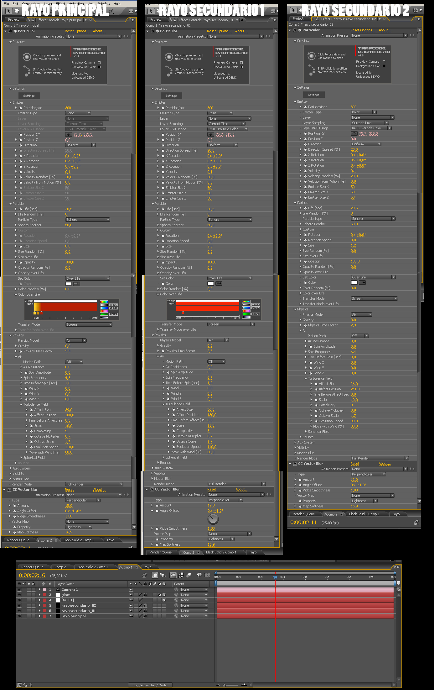 Hola a todos, les comento que buscando por YouTube encontré este video (genial) en el que hacen un efecto parecido a la lucha de Harry con Voldemort en Harry Potter y el caliz de fuego. Por lo que pude entender el centro (la unión de los dos rayos) está hecho con trapcode particular pero lo que a mí me interesa saber es como están hechos los rayos. Los que conocen After Effects ya saben que se puede hacer con ese programa, pero tengo mis sospechas de que no están hechos con After y que están hechos en 3d, pero no sé en qué programa (en la descripción del video pude entender que está hecho en 3d, aunque no estoy seguro a qué se refiere) si alguien sabe cómo está hecho le agradecería muchísimo la información.