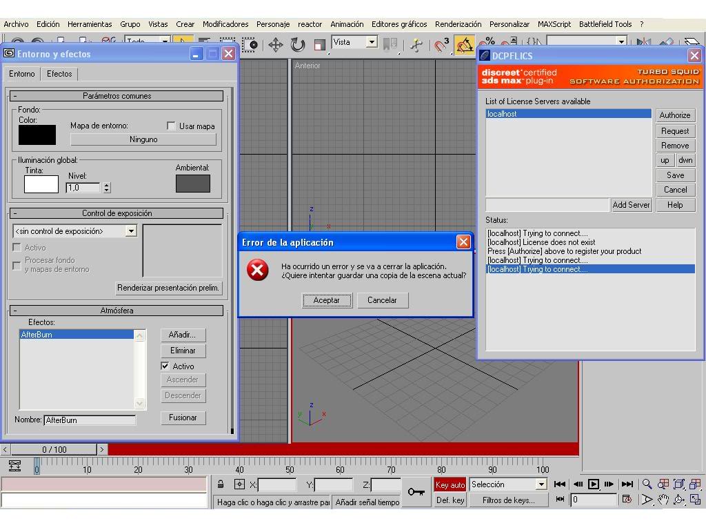 Veréis formatee hace poco el ordenador y ahora no puedo usa el Afterburn ni el DreamScape que es de la misma empresa, cuando me sale la ventana de autorize le doy y después de decirme intentando conectar con el servidor se me cuelga el max con un error que dice lo siguiente excepción sin gestionar.