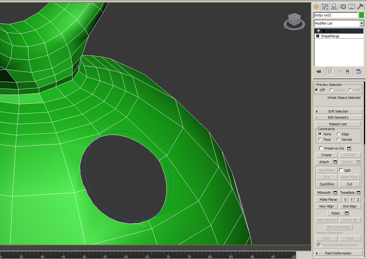 Necesito saber cómo aplicar un agujero en una superficie del botijo que queda en forma esférica. He probado en coger un vértice y aplicarle un chamfer, pero el agujero que resulta no está adaptado a la curvatura del botijo.