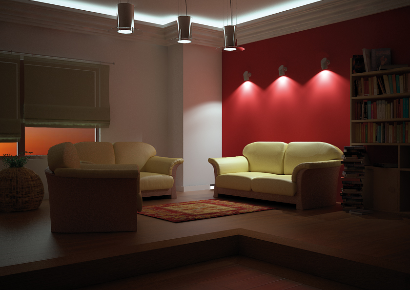 Yo reduciría la intensidad de la iluminación que sale de las molduras, se ve un poco excesiva, al igual que le reduciría también algo la intensidad a las luces photométricas en la pared, puede que quede mejor. Un saludo.