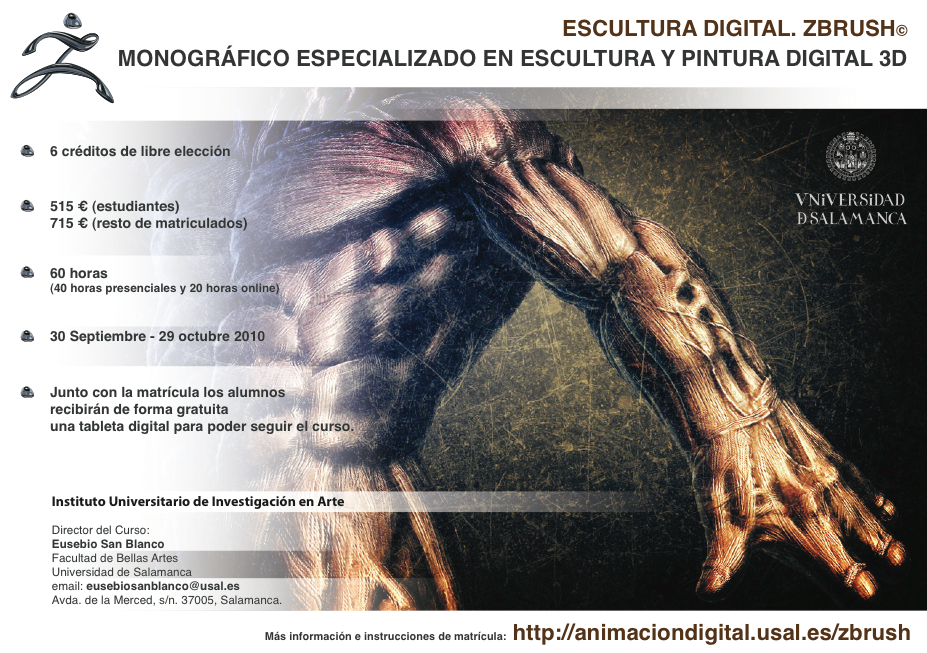 Para los que estéis cerca de Salamanca y os interesa os dejo el enlace. Es un curso de ZBrush que imparto en la universidad de Salamanca. http://animacióndigital, usal.es/ima...ursozbrush.pdf. Un saludo.