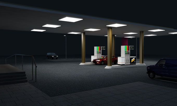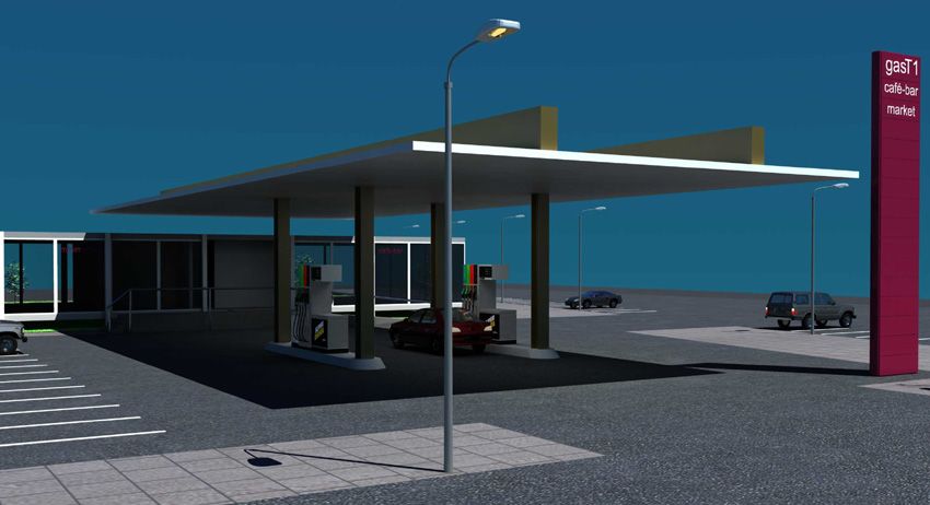 Bueno, como veis es una gasolinera modelada e iluminada en 3dsmax y Vray. Creo que quedaría mejor llenando todo ese vacío azul que queda a la derecha, pero no sé cómo ni con que y además no tengo mucho tiempo.