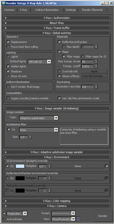 Adjunto los parámetros de mi render, por si alguien, en un primer vistazo, ve alguna locura. No sé si hará falta adjuntar algo más.