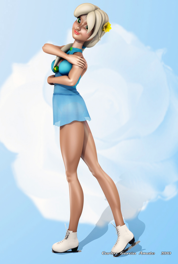 Me gustó mucho, solo unas cosas para tener en cuenta: En la segunda fotografía las manos se ven muy rígidas, habría que cambiarles un poco la postura, pero lo más grave me parece que está en las piernas, son muy largas, por ejemplo, en la primera imagen se ve como va subiendo en volumen y se corta y empieza la cola, pero muy chiquita en relación a la pierna, y en la segunda imagen se ve como la pierna es muy larga en comparación de los brazos estirados que parecen muy cortos, o tal vez sea el vestido muy corto lo que me pueda dar esa sensación, y por último la piel tiene mucho especular, pareciera como si fuera una muñeca, por otro lado, la princesa de hielo no tiene en ningún lado hielo, no mentira, es un chiste. (pero podría estar parada sobre hielo, con algún bonito material con algún Bump y reflect).