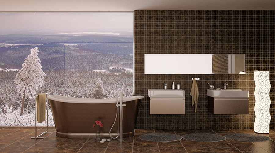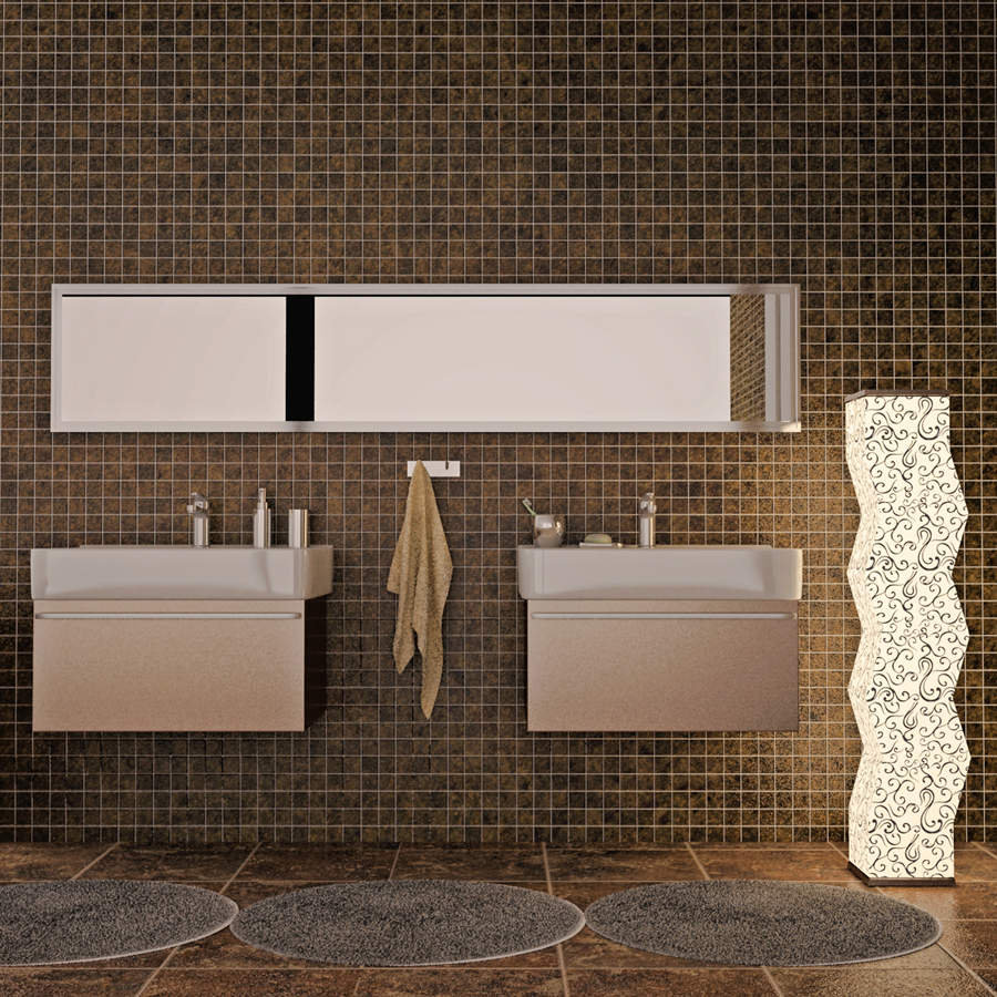 Hola. Bueno. Todos bloques, quizás, has querido practicar iluminación y texturas, pues noto bastante ruido en los lavatorios en su base, la iluminación de la escena no me convence y la lámpara de piso, está saturada, no queda realista ese fondo de la ventana, es bien chata, plana, no se logró un equilibrio de profundidad en ella, otro detalle, el espejo muestra que no hay más que eso detrás.
