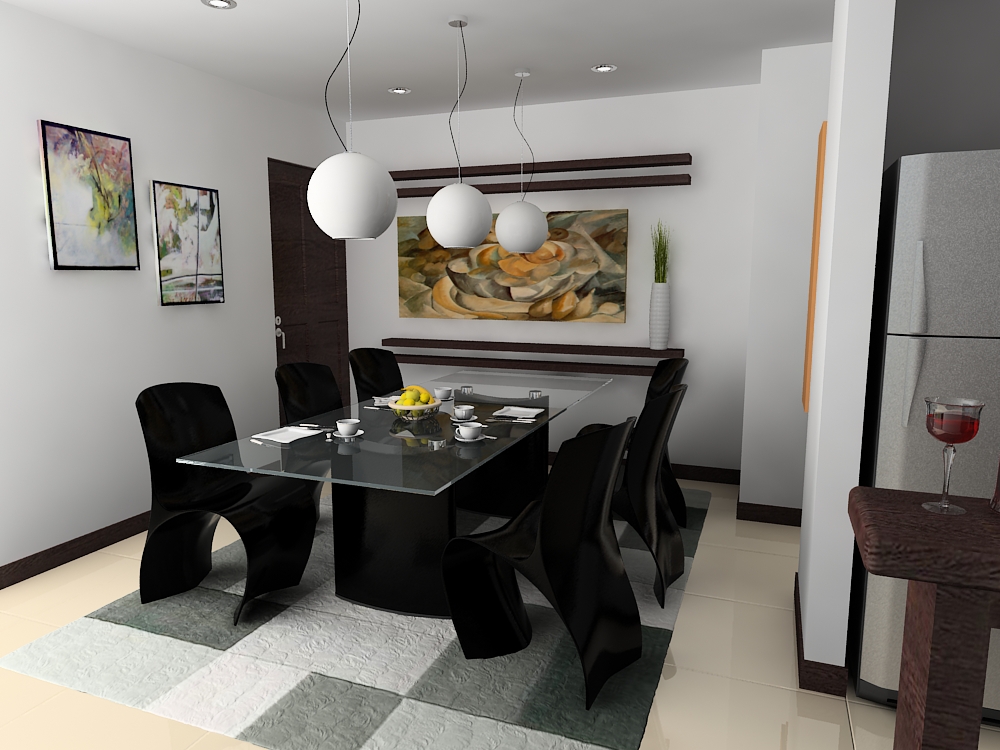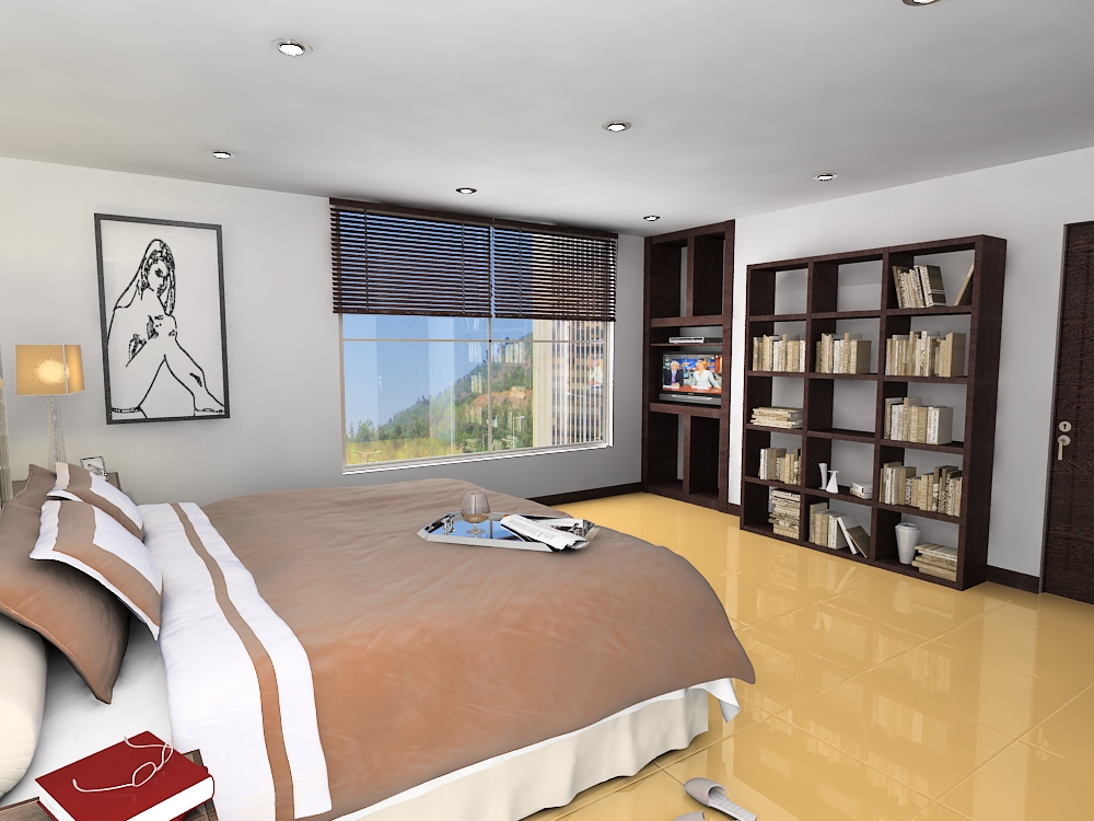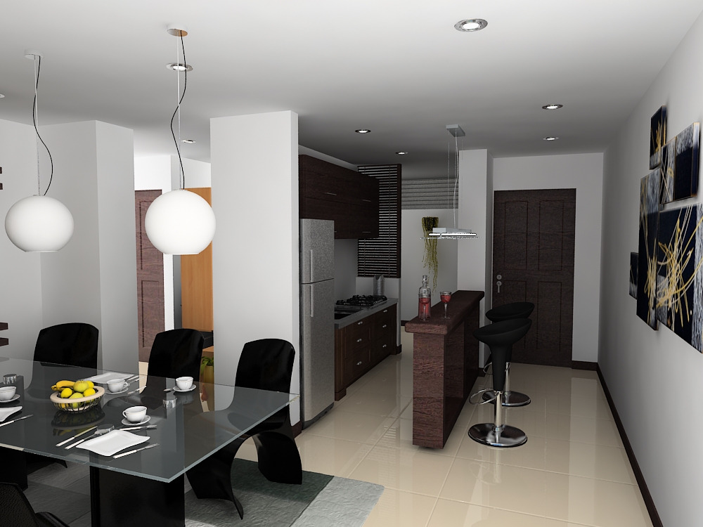 Hola, lo primero que llamo mi atención fue la posición del televisor, creo que está demasiado lejos para la ubicación que tiene la cama, bueno, como no especificas que motor de render usas asumire que es Vray y me permitire decirte algunas cosas: se ve que tienes los focos prendidos, pero no arrojan luz alguna, quizás ganaría un poco más matices si pudieras poner unas luces fotométricas o una target que iluminara la escena que está un poco oscura en la imagen del escritorio, las del comedor están bien, solo juega un poco más con la iluminación natural, está muy artificial, aprovecha la ventana en el dormitorio y pon luz solar, y así puedes evitar tener tantas Vray light que sobre iluminan la estancia, saludos.