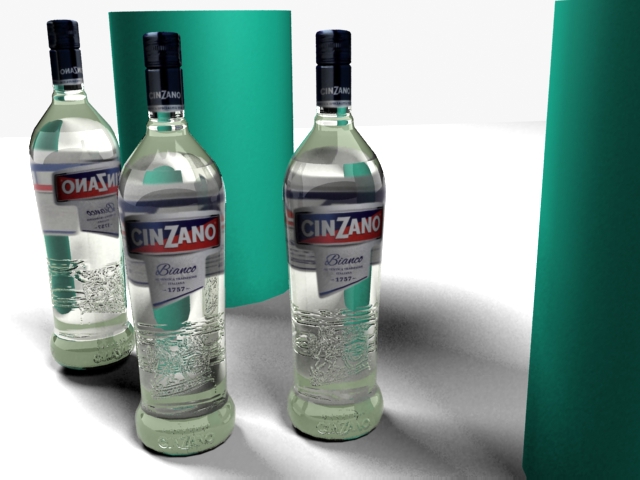 La segunda es una botella que tiene un mapa con refract al 100% y una máscara en Diffuse y en el reflect para poner la tapita y la etiqueta.
