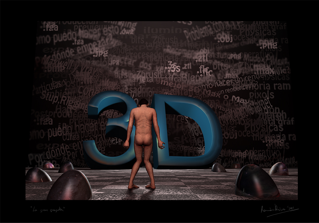 Pues eso, la gran question:así me sentía de apabullado cuando empecé a toquear esto del 3d. La idea me vino de un cómic clásico, y ya que estamos con preguntas, a ver quién acierta la referencia, inspiración, remedo, de dónde sale.
