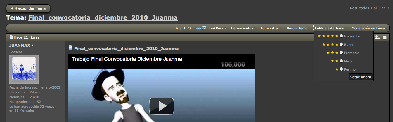 Como saben, el premio mención especial del público se otorga a quien más votos tenga recibidos por parte de los usuarios del foro. Les contesto a que visiten todas las habitaciones de los participantes, y les den a cada uno de ellos su valoración. Valoren solos hilos que contengan el trabajo final de cada participante. Para valorar, hagan clic en el botón calificar este tema, y denle una calificación de.