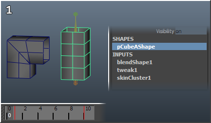 Añade la malla de referencia (por ejemplo, pcubeb) como objetivo del Blendshape. Ajusta el valor de peso inicialmente en 0 para mantener la forma base de la malla. Esto permitirá que cualquier animación de los joints no se vea afectada al principio.