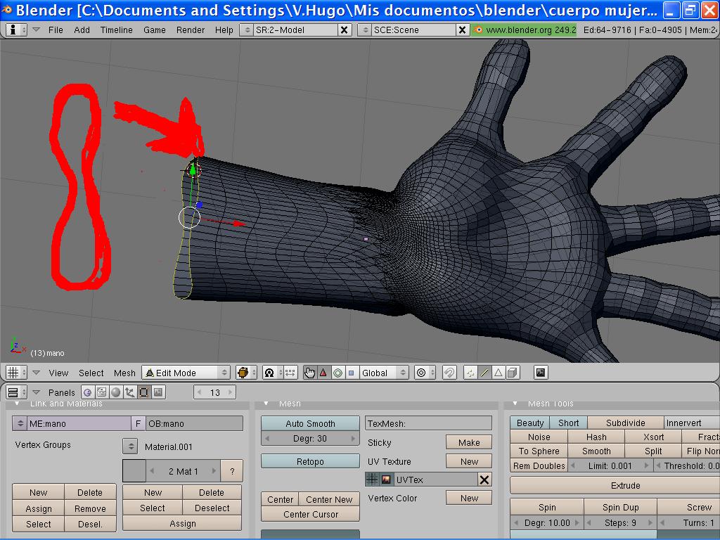 Además, del acertado comentario de Carleptos sobre la unión del brazo con la muñeca, veo demasiado densa la malla de la mano, a menos que necesites mucho detalle lo veo innecesario. Si optimizas esa geometría seguro que logras lo que dice Carleptos con mayor comodidad.