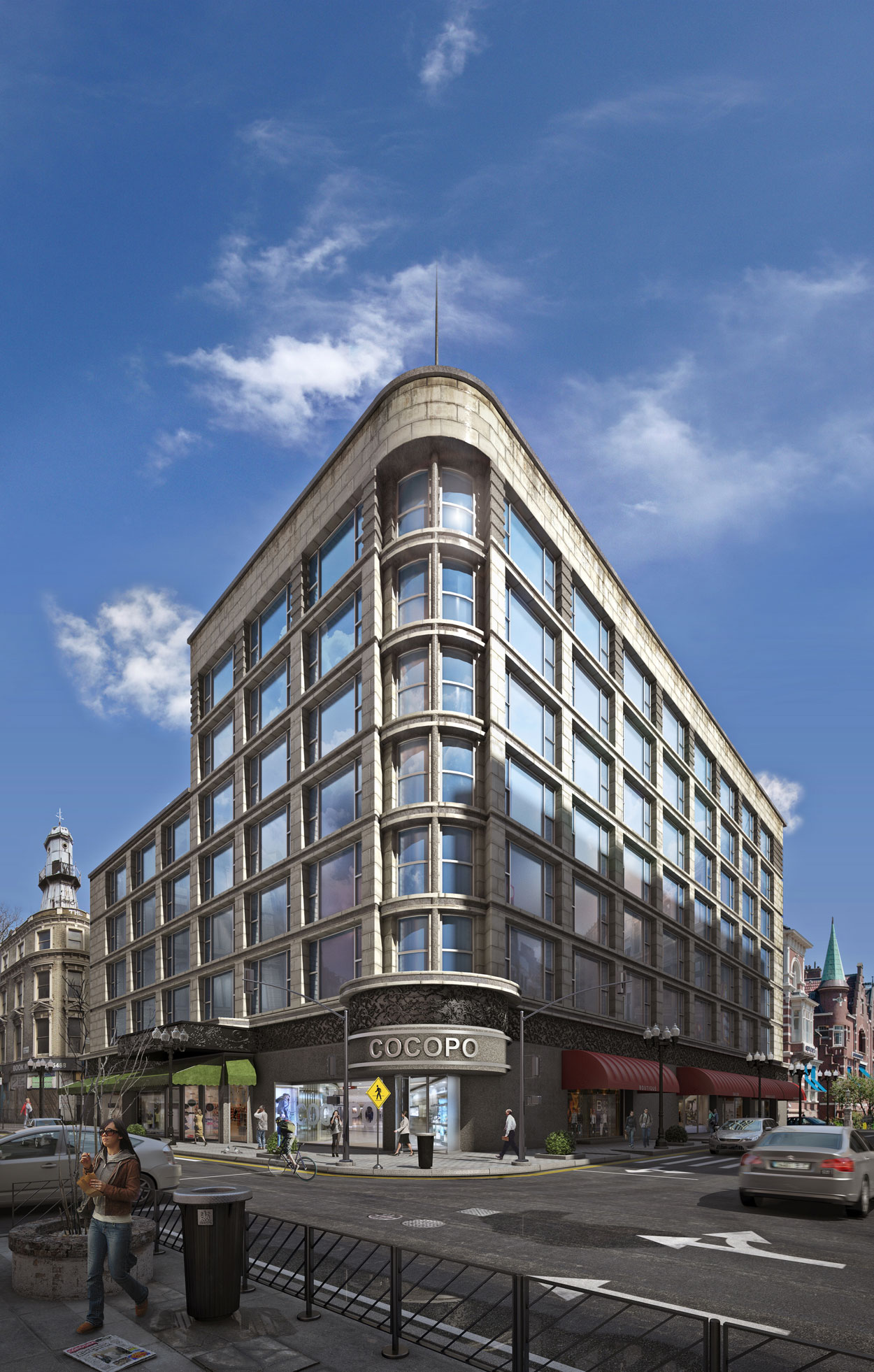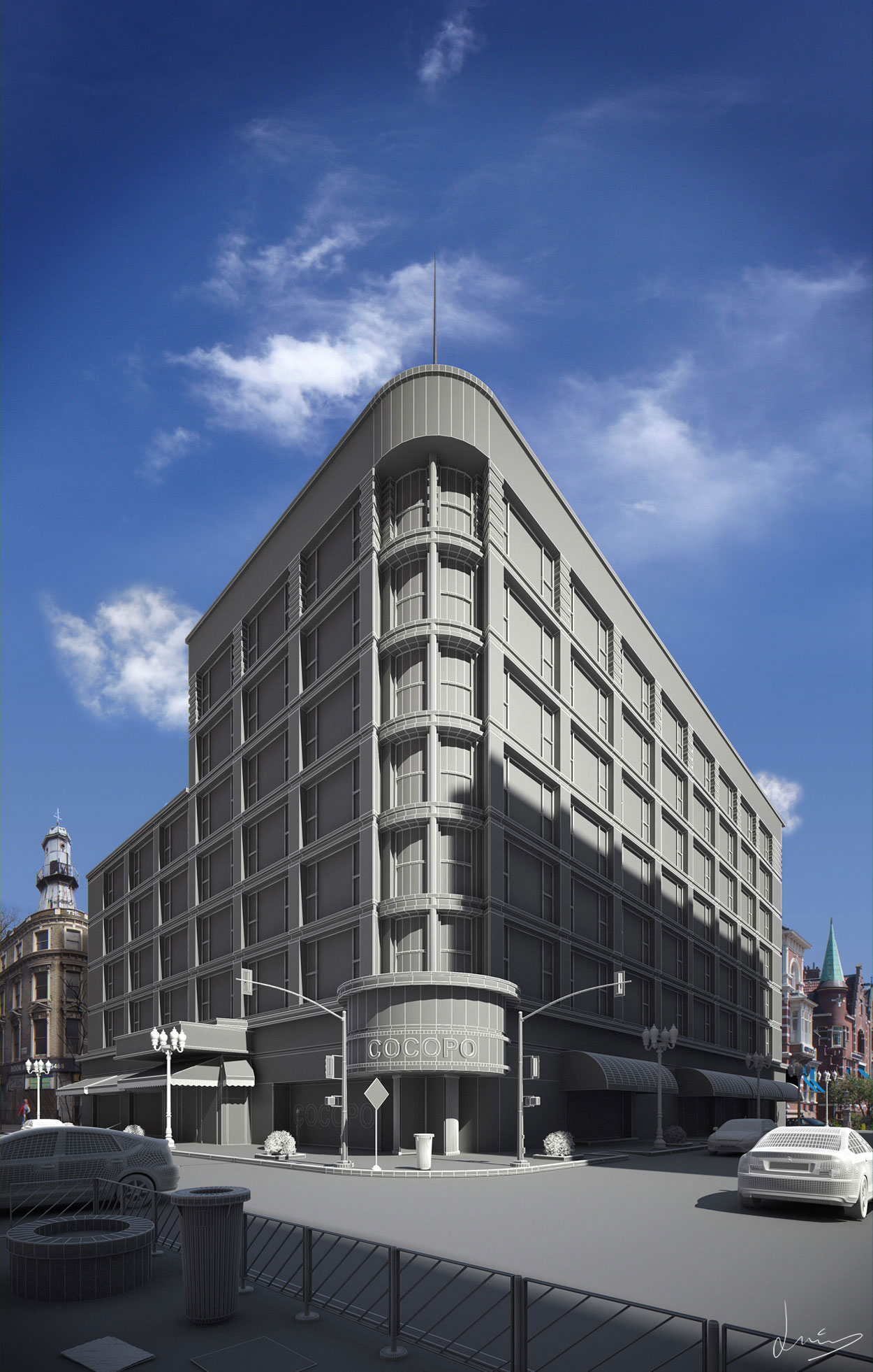 El edificio está basado en el de carson pirie Scott de Chicago, esta es una mini versión y bueno con sus más y sus menos diferencias. Como soy cordobés, pero resido en esta ciudad le he metido al rendering diferentes detalles de las dos ciudades, como el periódico que está en el suelo y la papelera con el logotipo del ayuntamiento de Córdoba, pero con señalizaciones y elementos como las alcantarillas de la ciudad de Chicago, una tontería vamos.