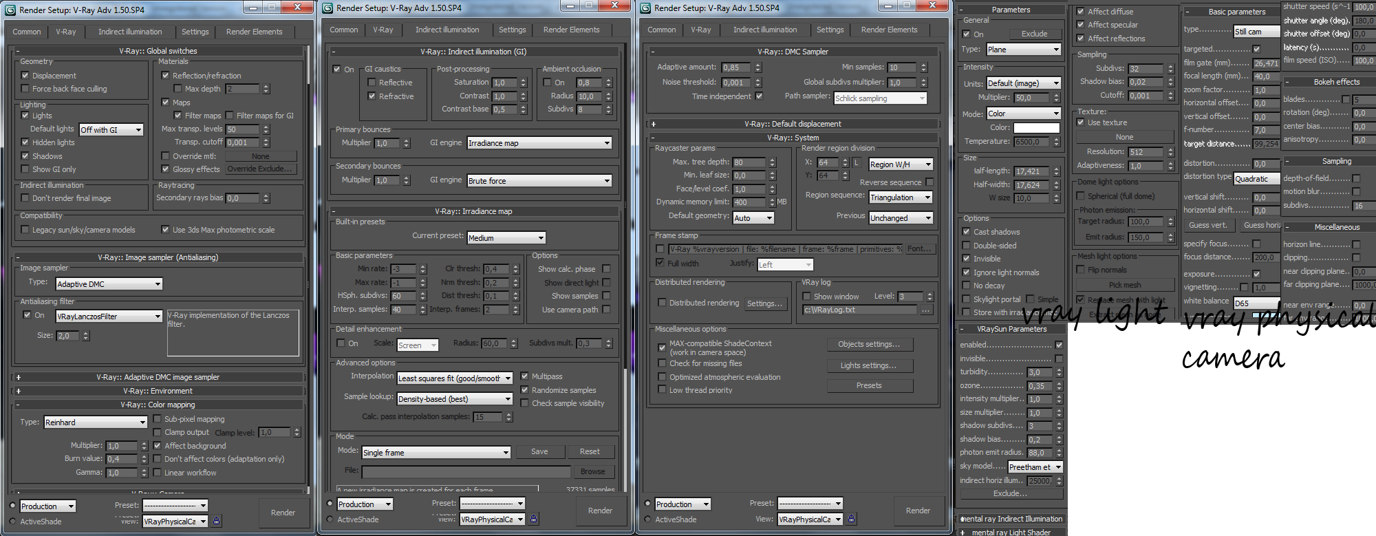 Estos son los setting con los que suelo trabajar yo en interiores, por si te sirce de algo. Al sol no le toco ningún valor, y a la cámara, en interior voy jugando según su posición con los valores del fnumber y Shutter Speed, pero siempre le pongo el filtro dayligth.