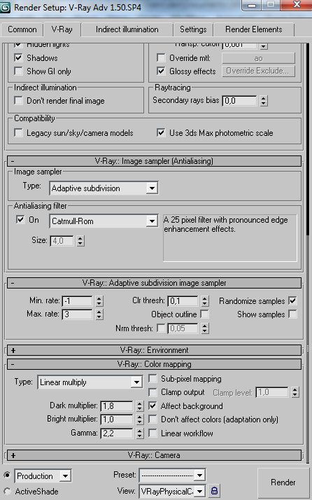 Buenas a todos, estoy empezando en este mundillo, y ahora estoy realizando mi primer trabajo con Vray, en verdad es una escena sencilla y no muy elaborada y tampoco hay nada modelado es todo de bilbioteca, pero como estoy intentado entender los conceptos básicos de Vray, estoy haciendo este para ir entendiendo todo poco a poco, bueno al lío, el caso es que llevo un par de días intentado averiguar cómo quitar el ruido que me sale en algunas zonas y también hacer desparecer los bordes borrosos de la sombra que me sale en el suelo, así que, si alguien me echa una manilla se lo agradecería mucho, todos los materiales están a 16 subdivisiones, la escena esta iluminada con Vray Sun y Vray light, y con cámara Vray Physical, y realizada con 3d mx 2010, aquí están todos los parámetros del render de las luces y de la cámara, gracias de antemano, saludos.