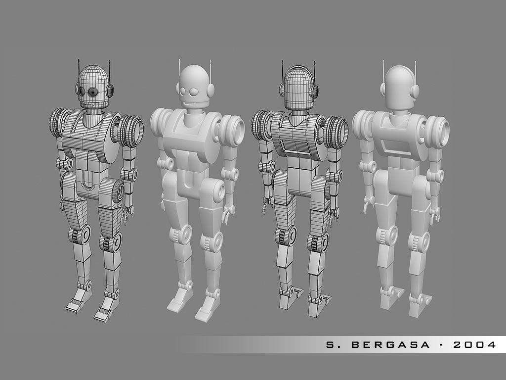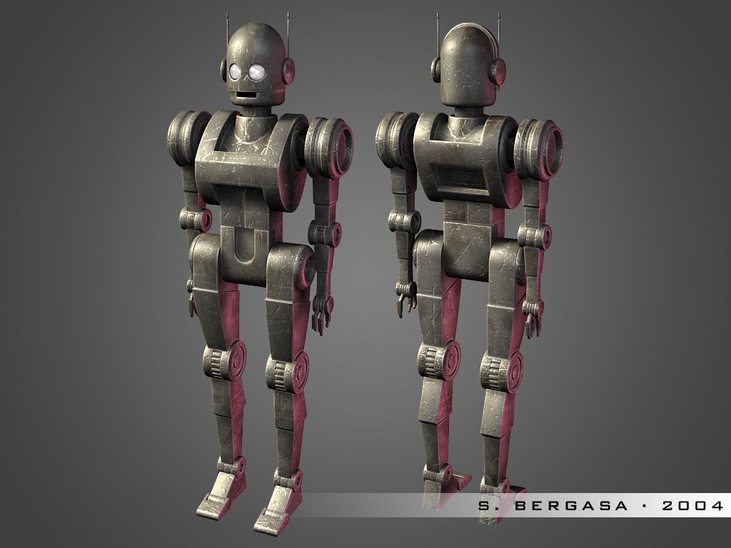 El protagonista de la animación va a ser un robot bastante simple. La idea era crear un personaje que resulte sencillo de animar, y creo que está es la mejor opción. Ya está modelado (3ds Max 5) y texturizado (Photoshop), así que, me falta hacer el rigging y animarlo.