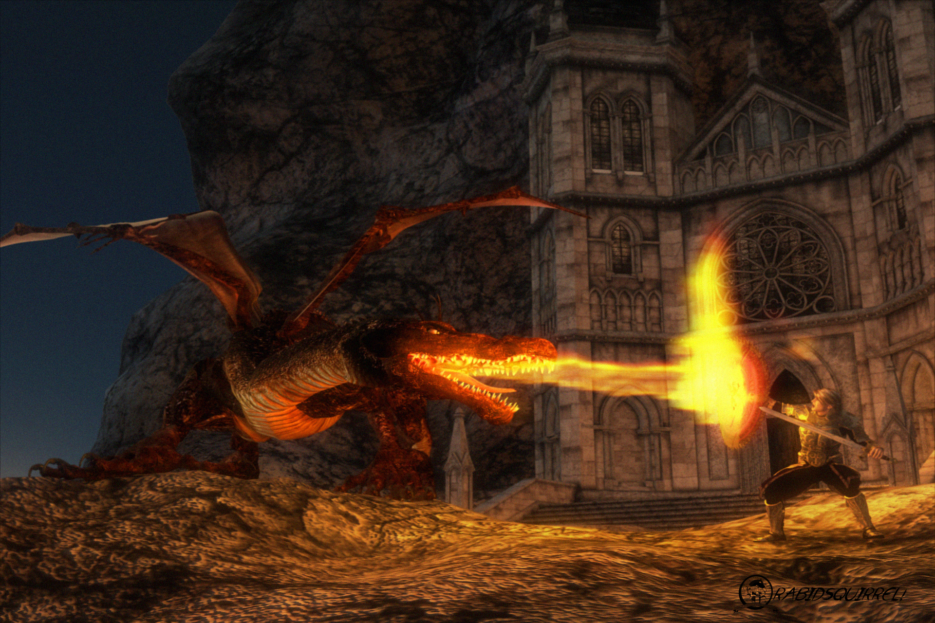 Me gusta bastante, pero veo cosas a mejorar: Deberías jugar más con la profundidad, está un poco plano todo. La iglesia y las rocas del fondo están lo suficientemente lejos como para que un poco de desenfoque (sutil) y algo de desaturación les siente bien, así separas un poco más el primer plano con el dragón y el caballero de todo lo demás.
