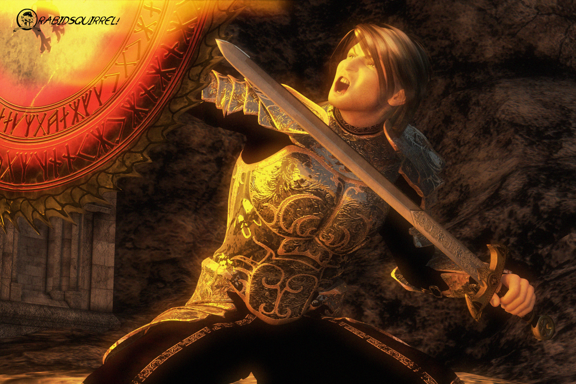 El rebote de forma vertical del fuego contra el escudo no me acaba de convencer. Y en general, el fuego tampoco: su luz es demasiado apagada (debería tener mucha mayor intensidad), y le falta volumen. Algo más cercano a la imagen que adjunto estaría bien.