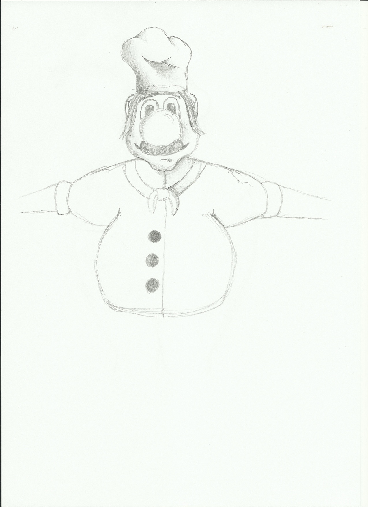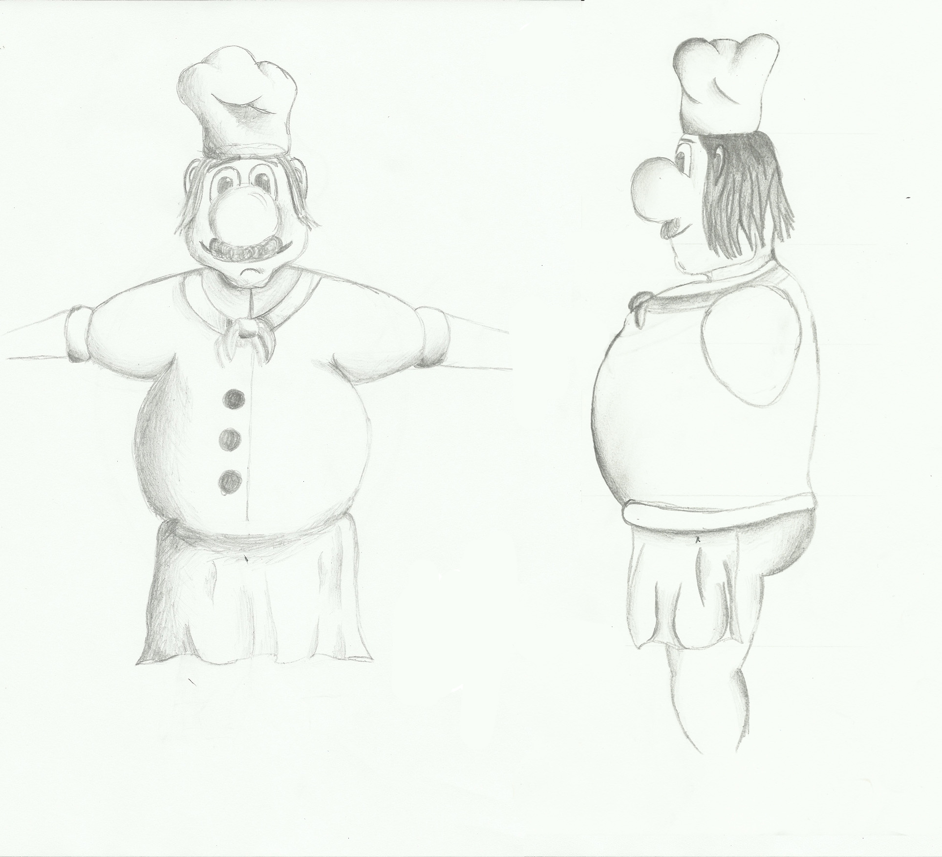 Además, yo siempre me he centrado en la parte de modelar, pasando por alto la texturización, animación, rigging etc. Con lo que con este grupo estoy obligado a hacer yo el rigg, el texturizado, y la animación al personaje, así como los bocetos previos ya que no tenemos artistas de lápiz (cosa difícil por que nunca he dibujado nada que no fueran rallajos en la agenda). Así que, sin más dilación (ejem), los primeros bocetos a lápiz y escaneados del cocinero.