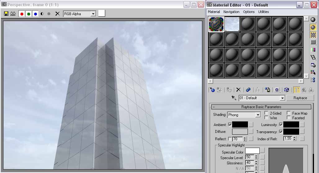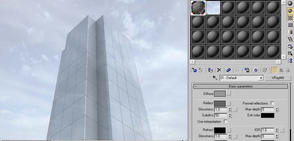 Mirad, he hecho todo lo que hay en el mensaje del suelo que brille, mire f1, busque en internet, pero mi libre interpretación me parece que fue una chapuza. Necesito hacer un edificio de cristal, de esos que el critale es en tono azulado y que se ve también plateado, los típicos cristales con los que se cubren edificios y, no consigo dar con al forma, llevo un par de días y lo tengo que presentar hoy. No consigo que quede un buen reflejo, exagerado tal vez, lo único que consigo es algo entre reflejo y transparencia bastante mala. Alguna idea? Gracias desde ya. Saludos.