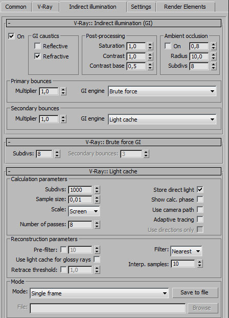 Yo usaría 8 muestras y 3 rebotes para empezar, si te sale ruido ve subiendo el número de muestras a 12, luego 16 y así hasta que no te salga ruido. En Vray 2.0 el brute force va algo más rápido que en versiones anteriores, eso sí, bájate el service pack para Vray 2.0 vale la pena.