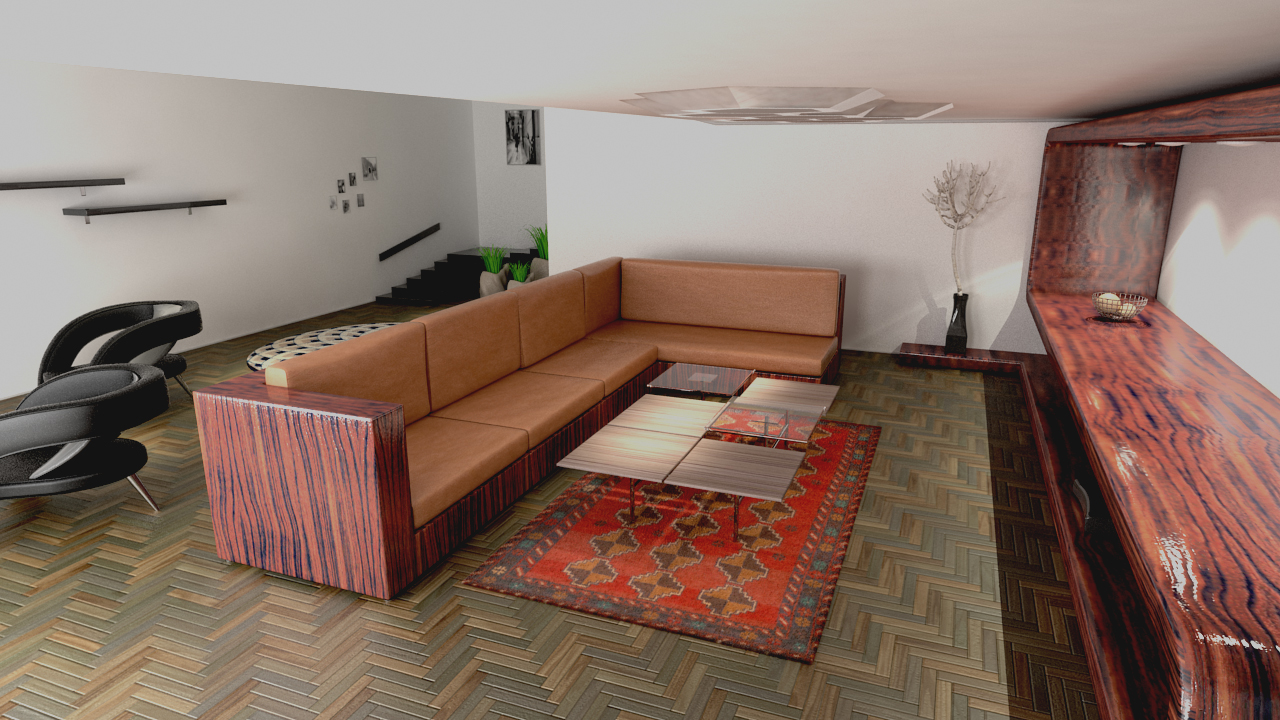 El mapeado del mueble tiene poca calidad. Los focos queman la pared y el mueble, deberías bajar la intensidad. Le falta equilibrio a la imagen llama demasiado la atención la parte derecha y la izquierda pasa desapercibida. Y la cámara deberías bajarla unos centímetros para que la vista sea la del ojo humano (más o menos). En general el proyecto está chulo, y mejorando algunas de estas cosas, el resultado puede ser bueno.