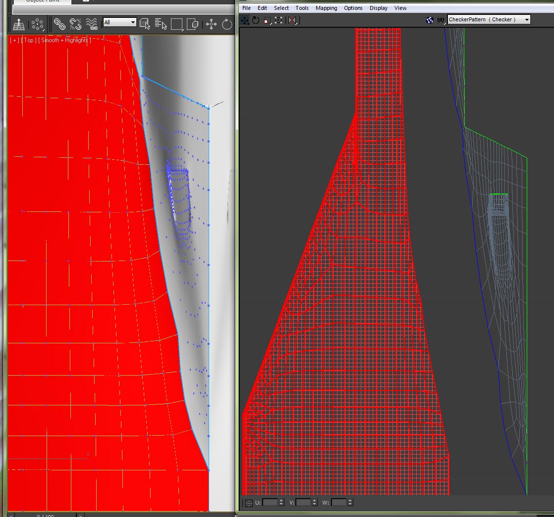 Y como pueden ver en esta selección aún no le he dado al quik planar map, y si se fijan bien el contorno en el viewport no es el mismo que en el edit del Unwrap, lo cual al texturizar en Adobe Photoshop me da problemas de continuidad, en la de alado como verán si esta con el mismo contorno.