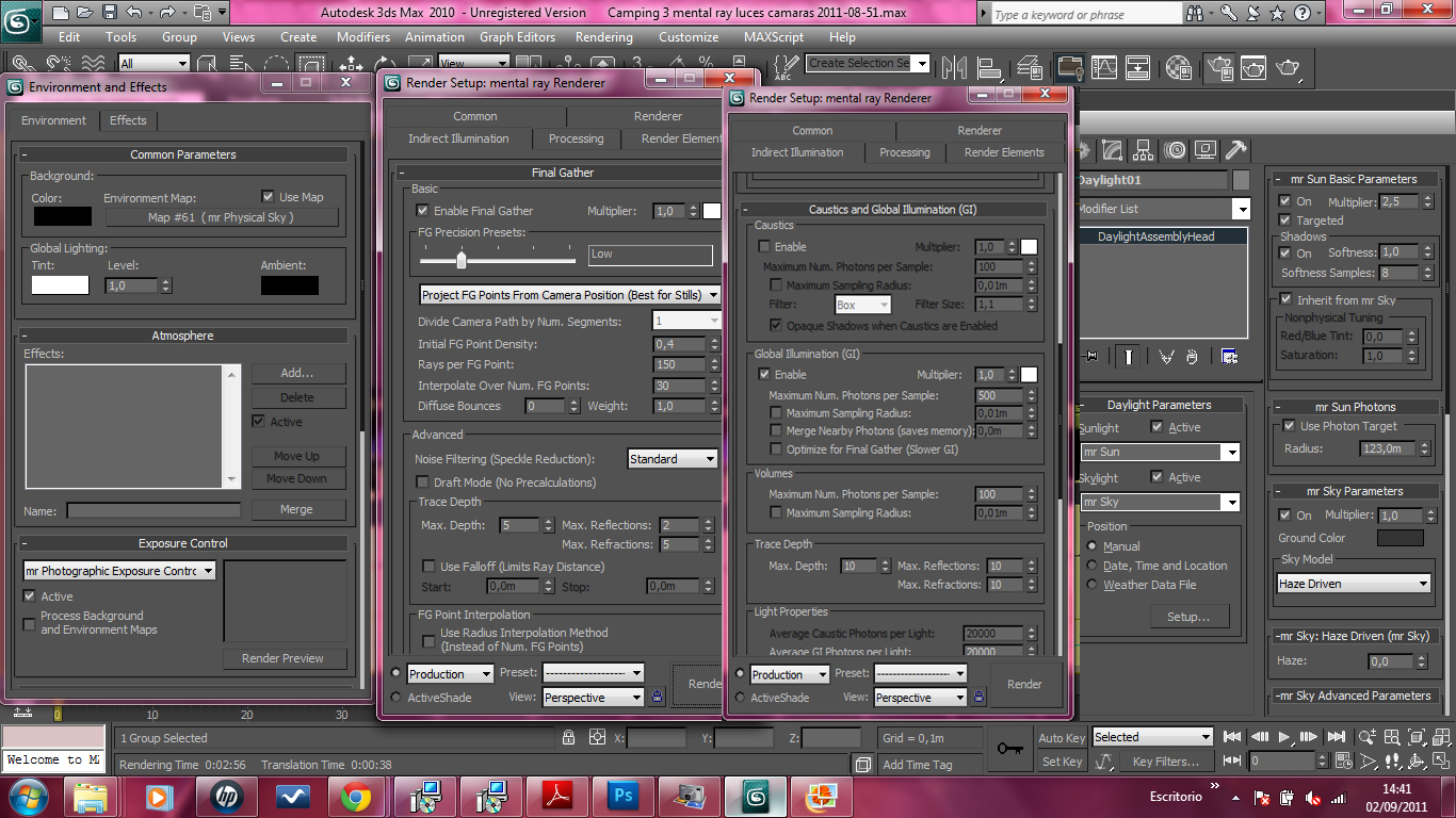 Buenos días, estoy realizando uno de mis primeros trabajos con 3ds Max de un exterior, y como siempre, me bloqueo en la iluminación, he puesto una luz skylight, Final Gather activado, global illumination también, Mental Ray Sun Photons. (os adjunto imagen con parámetros) y no sé muy bien que cambiar o que configurar para que quede más real y se vea mejor, espero que me puedan echar una mano, muchas gracias.