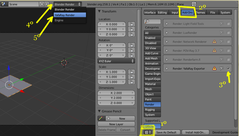 5º seleccione Yafray y ya verás que las ventanas de render y otras más, cambian de configuración.