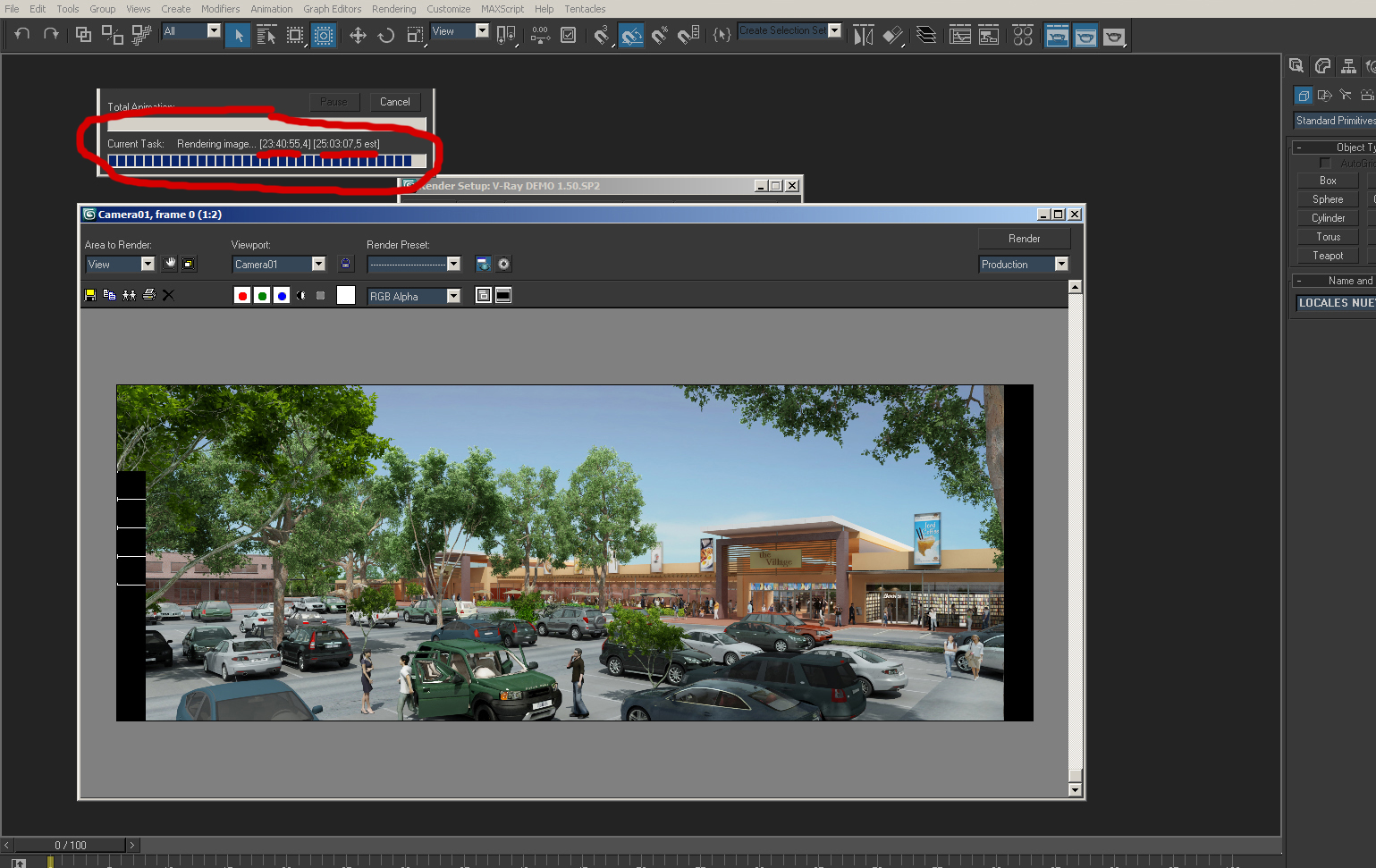Entonces amigos del 3d lo que les pido es alguna explicación de cómo fue posible todo ese tiempo con una máquina bastante buena y con unos seteos tan bajos. Sobre todo, porque después la escena la optimicé hasta bajar de 2.700.000 polígonos a 1.170.000, la imagen la saqué en 2048 x 900 px aproximadamente.