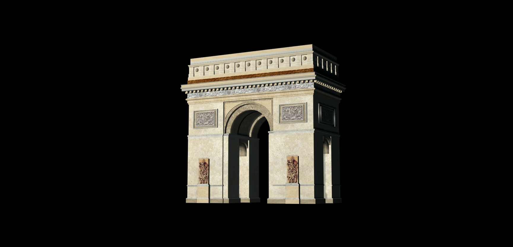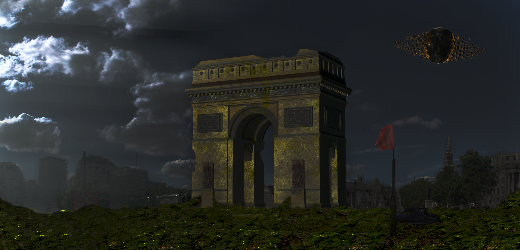 Arco del triunfo: modelo en 3dsmax y posterior Matte Painting en Adobe Photoshop, con una integración en una plaza que nada tiene que ver con la ubicación real del arco del triunfo. El Matte Painting está hecho de manera rápida (podéis ver cómo los trozos destruidos están bastante mal hechos), lo que verdaderamente me importa es el modelado. Un saludo y mucho gusto por participar en este gran foro y web.