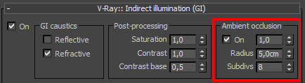 Como opción, dentro de la iluminación indirecta, lo encontramos dentro de la pestaña Vray - Indirect ilumination (GI). Éste método afectará de un modo global a toda la imagen por igual, por lo que podemos usarlo para aplicar el efecto de un modo sutil para realzar los detalles de toda nuestra escena. Éste, como todos los parámetros que añadamos a nuestro render, consumirá algo más de memoria y tiempo, pero nos dará ese toque que necesitamos.