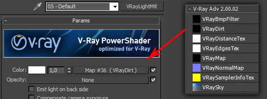 Como pase de render, necesitamos generar un mapa de oclusión o suciedad, independiente a nuestro render. Tendremos que elegir entre dos alternativas. En la primera crearemos un material nuevo Vraylight MTL y le asignaremos, en el canal de color, el mapa Vray Dirt.