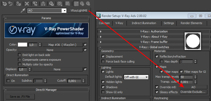 Una vez terminado de crear el material vraylightmt con el mapa Vray Dirt en su interior, tendremos que trasladarlo al slot override mtl pestaña Vray: global switches.