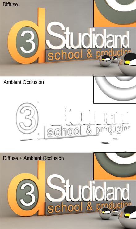 Ambient Occlusion o oclusión ambiental es el método de sombreado que se utiliza en animación 3d para crear un efecto de iluminación global. El objetivo es conseguir definir caras con luz y caras con sombras de manera muy difuminada.