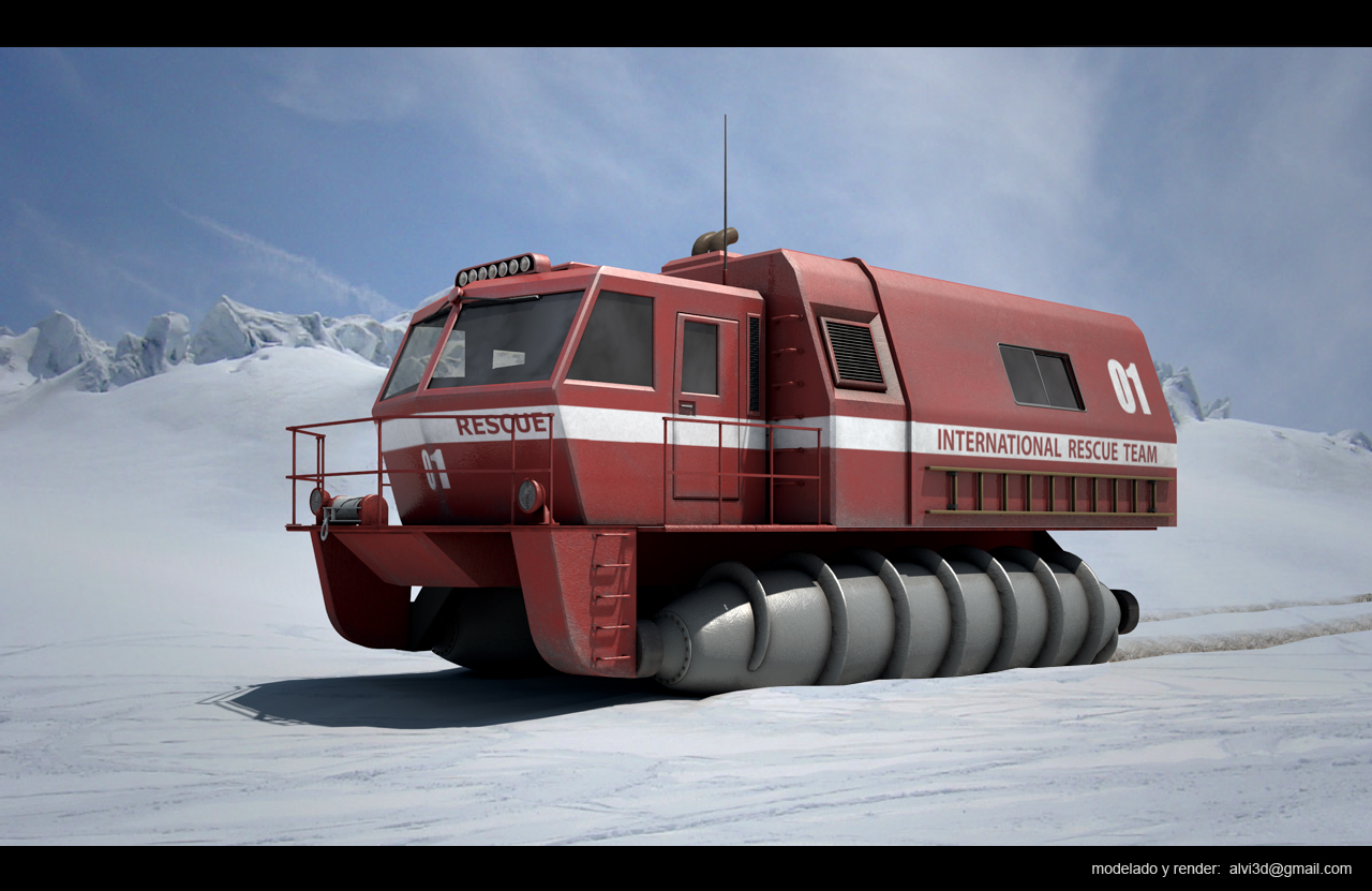 Un vehículo de rescate para zonas polares y terrenos complicados. Se me ocurrió hacer este vehículo como transporte de un equipo internacional de rescate para expediciones en zonas polares y zonas donde hayan ocurrido desastres y de difícil acceso. Es anfibio y su propulsión esta basada en el tornillo de Arquímedes.