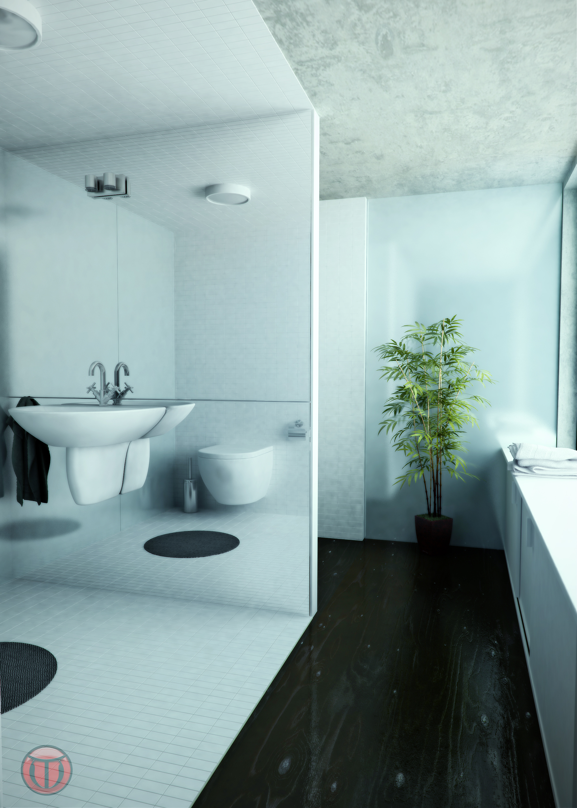 Por otro lado, para enriquecer el render, optaría por encender las luces del baño y así generar nuevas sombras y más profundidad. Un saludo.