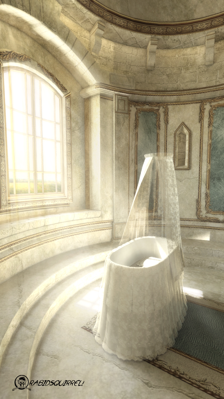 Hola, me gusta mucho, la iluminación está genial, texturas todo, lo único que el visillo o la mosquitera que tiene la cuna, que parece que está flotando, hace que pierda el realismo que tiene la escena, se ve realista, pero al estar eso ahí, flotando, pues pierde y desmerece un gran trabajo tío. Un saludo y enhorabuena.