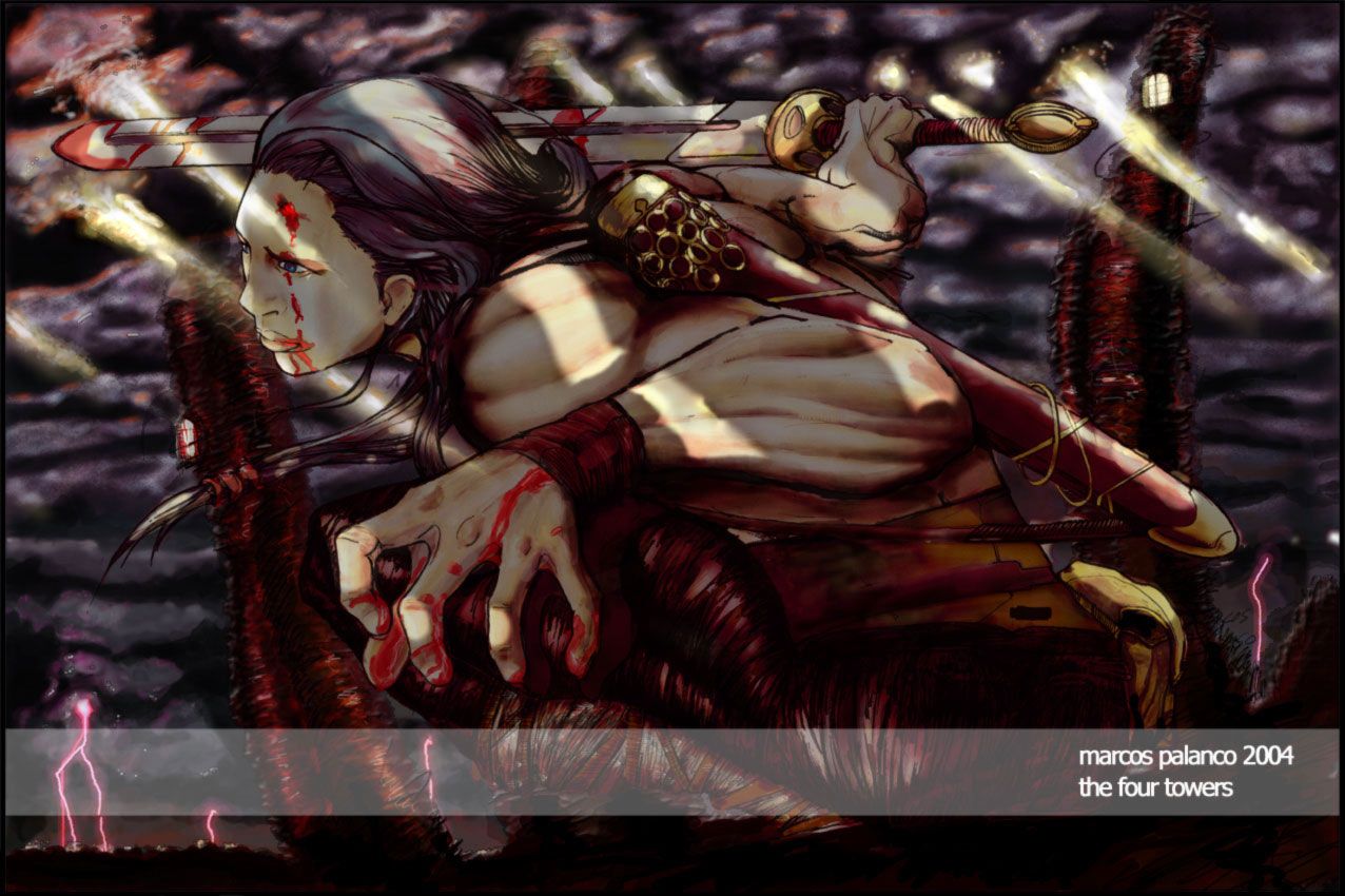 No hay historia detrás. Aunque en otros dibujos que hago si la hay. Esta imagen son sólo imágenes recurrentes, bárbaro con espada, nuber, lucha, torres altas. Esta más basado en imágenes barrywindsor-Smith que otra cosa. Gracias a todos por responder, un saludo.