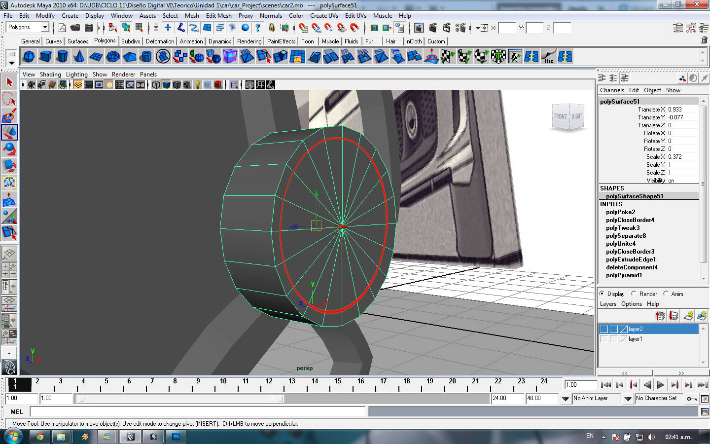 He hecho un polygon pipe y lo he rotado a 90 grados luego he seleccionado los Edge y he tapado un lado con la opción file hole y luego he seleccionado la face nueva que de ha creado con el Fill Hole y le he dado en poke face para que me ponga las divisiones que tiene el polygon pipe mi duda es porque no puedo ponerle Split selected Edge ring en la superficie según como muestro en la fotografía que he subido, alguien me puede explicar.