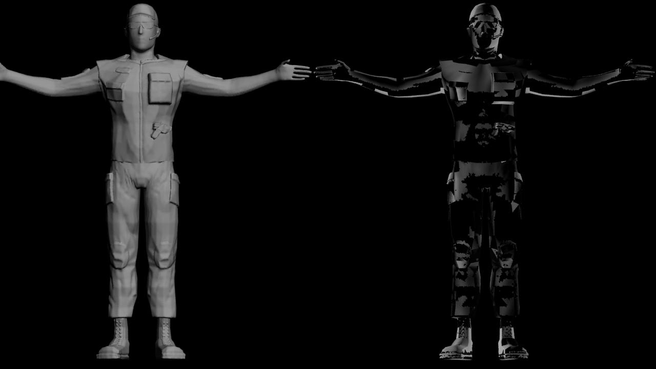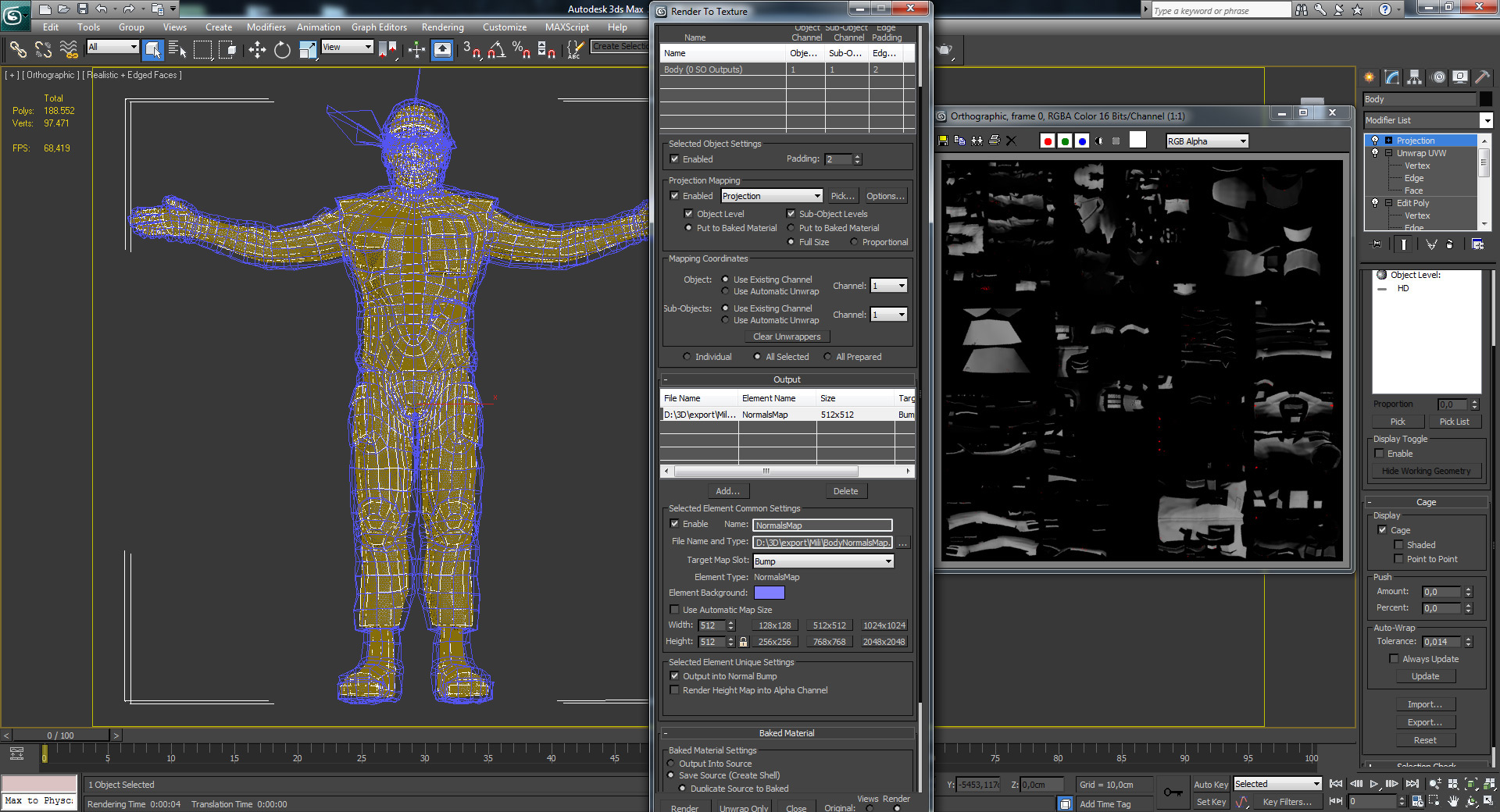 He realizado un personaje Low-pol y estaba creando su high-pol. Quería ir viendo con las normales como iban quedando los nuevos detalles, pero veo este terrible resultado, no veo que me salga tanto rojo en el render to texture como para salir tan mal. Le he dado vueltas, pero no lo mejoro.