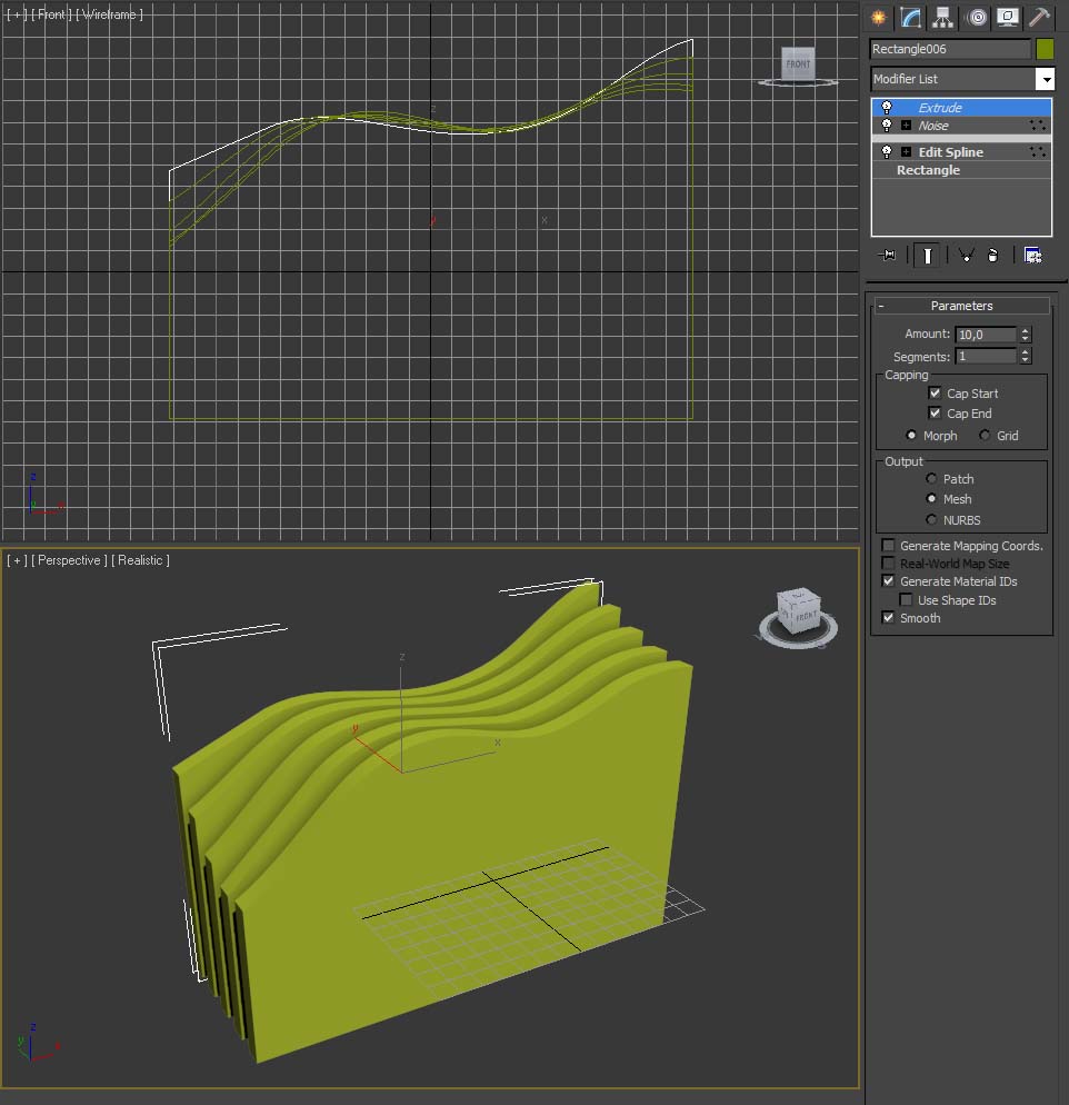 Hombre, para hacer exactamente eso que pones como ejemplo, se me ocurre una forma muy tonta, en la vista front haces un rectángulo->edit Spline, seleccione el lado de arriba->divide segment. Dos o tres nada más. Seleccionas los vértices, clonas como referencia moviendo en la vista top hacia arriba, la separación que quieras dejar entre placas, seleccionas todas las placas (Splines) y las das un ruido. Juegas con los parámetros hasta obtener el resultado deseado, extrude, punto pelota.