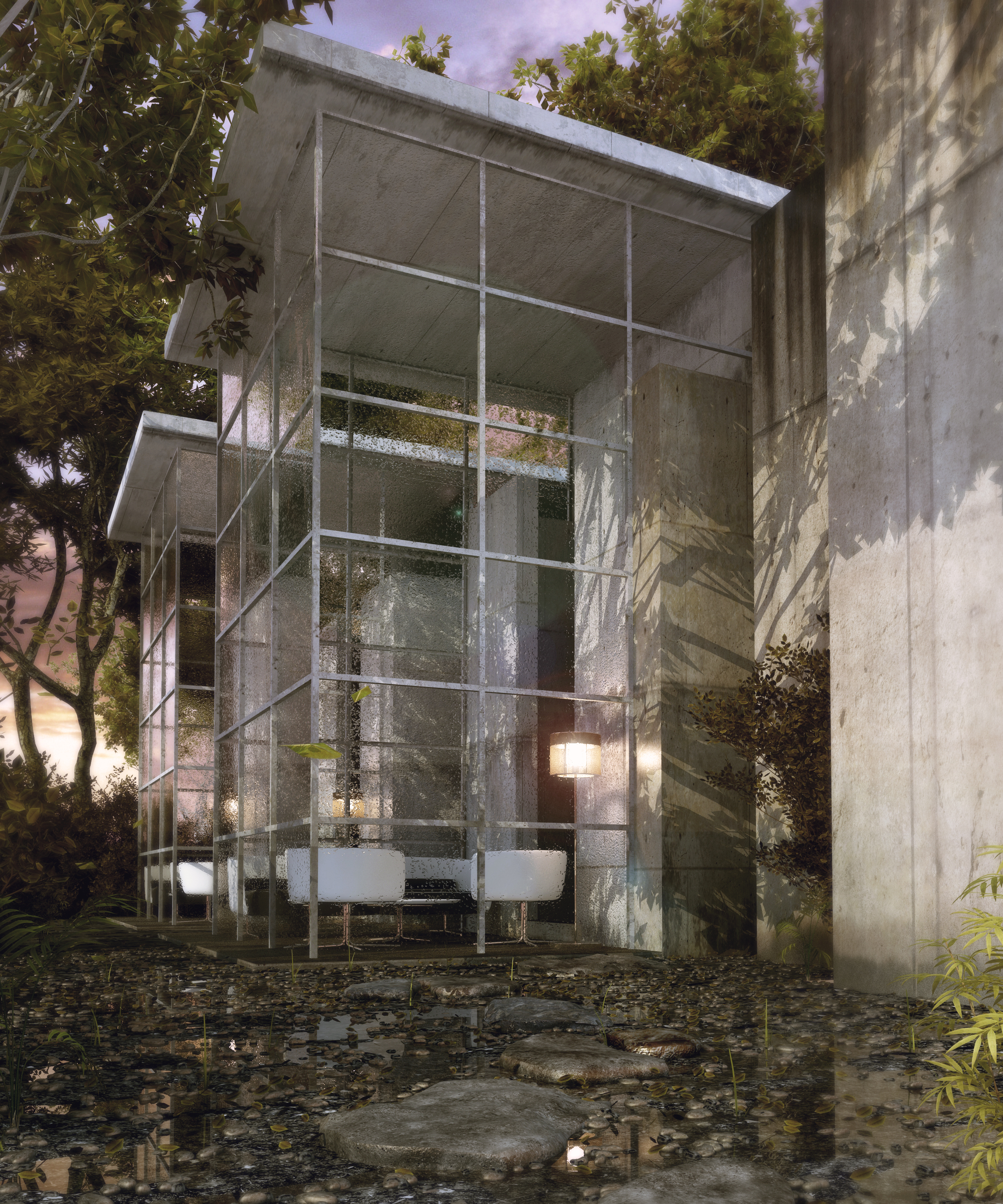 Esta genial. Felicidades. No es por sacar fallos, pero la opacidad de las hojas de los árboles no está correcta, el tema canta cuando al mirar la sombra proyectada en la pared de la derecha, corrígelo hombre, que es una pena para lo genial que está el render.