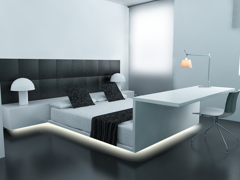Hola, pues en mí humilde opinión el concepto es bueno, pero siento que la cama esta flotando, yo diría que la luz debe salir más fina, y cambiaría el color de ésta, para que combinara con el color de las paredes y del estilo pondría una luz más blanca, la mesa es minimalista y el diseño ciertamente es muy simple, pero se ve bien, me agradan mucho las lámparas de junto a la cama, pero la que está en el escritorio tampoco combina mucho que digamos, por lo demás la idea está muy bien, échale caña que sé que puedes mejorarlo mucho más. Un saludo.