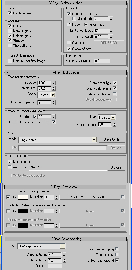 Hola foreros. Aquí vengo con una carga de imágenes para ver si me pueden ayudar un poco. Es una prueba de iluminación con Vray que lleva todo el fin de semana tralléndome de cabeza y eso es lo que he conseguido. Les dejo los render y la configuración de Vray, lo peor: el grano tan horrible every where. (entre todo, eso es lo que más me mata).