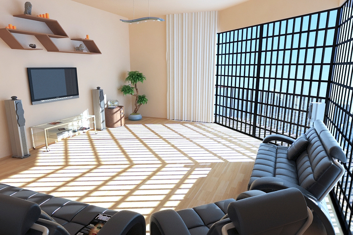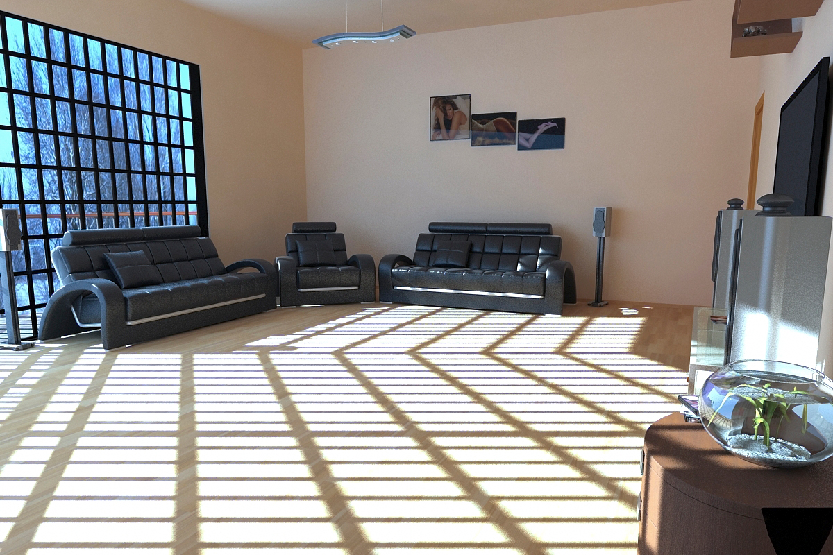 A nivel texturas lo veo bastante bien, ¿cómo lo del sillón, mesita de vidrio, la pecera etc, lo que no me convence es mayormente el piso, le noto mucho ruido en dónde el sol pega y en dónde no pega, faltaría cierto brillo, ¿puede será.