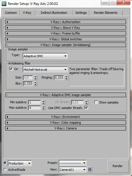 Buenas, quisiera saber la opinión de otros que estén probando la nueva versión de Vray respecto a antialiasing. Me está pasando que renders que antes sacaba con Mitchell-Netravali y adaptative dmc como vienen por defecto, en Vray 1.5 service pack 4, ahora me salen con problemas con el Vray 2.0.