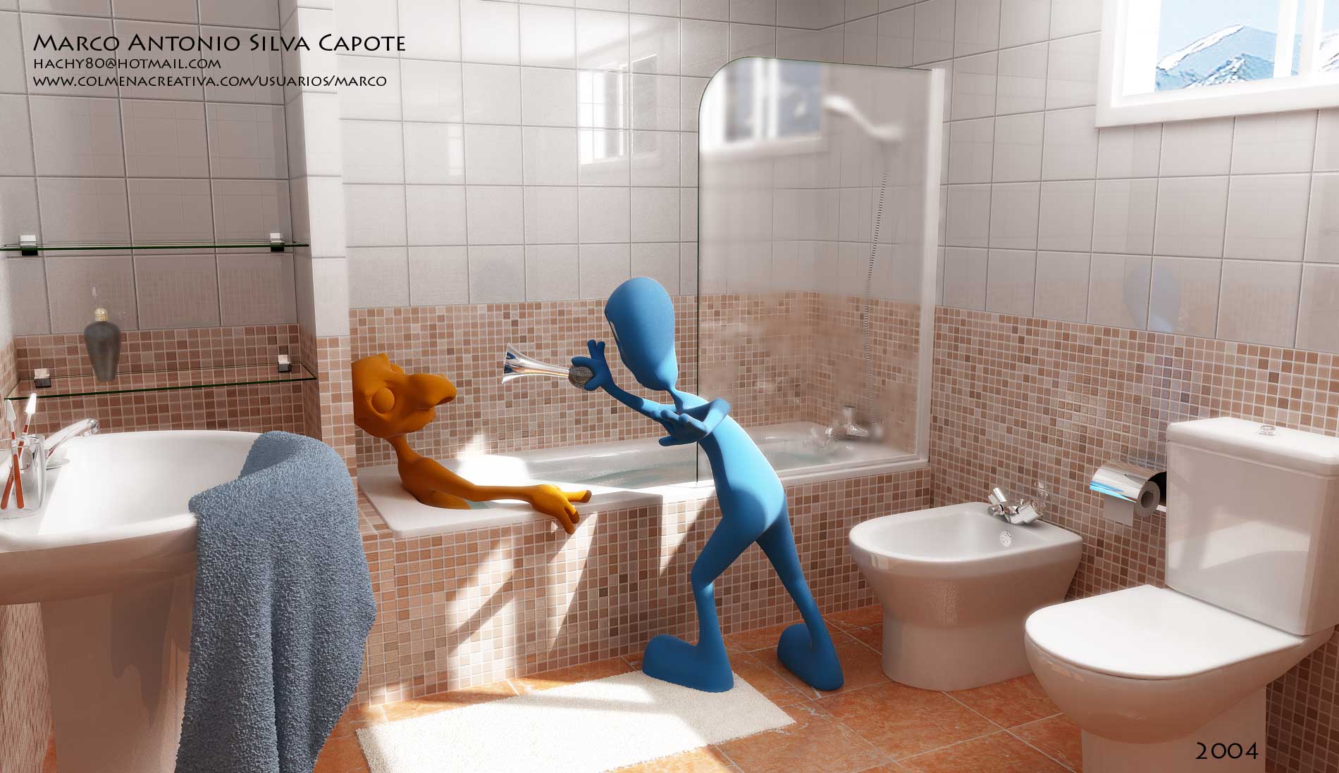 Veamos, las escena esta trabajada, me encanta en serio, pero a ver, defectos, pues la trompeta esa tiene demasiados reflejos, te jode la armonía de la escena, el bote de champú que hay en las lejas de cristal de la izquierda no se ve muy bien y el lavabo se ve algo quemado, ah, y el papel higiénico está muy recto.